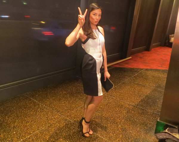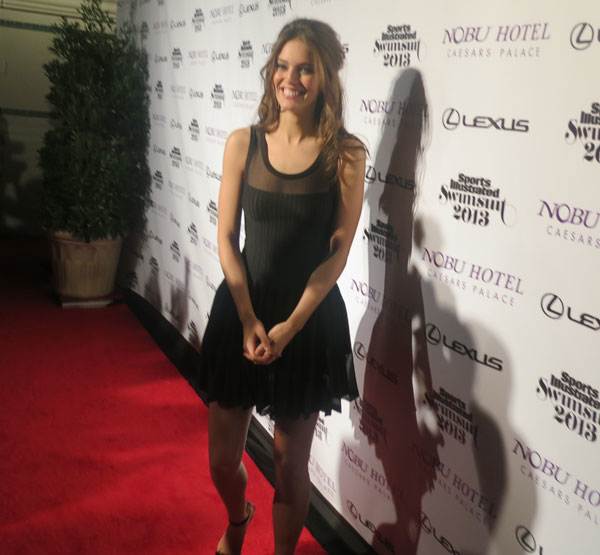 After the projection mapping, the girls headed to Marquee, a club in the Cosmopolitan Hotel. But first, they had to walk the red carpet. In this photo, Katherine Webb poses with her first-ever SI Swimsuit photo.