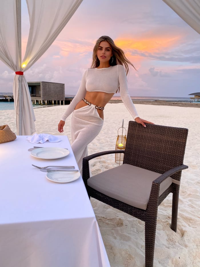 Here Brooks embraces an asymmetrical look in a Bronx and Banco maxi dress. Bronx and Banco is an Australian luxury brand popular among many celebrities, including Selena Gomez and Camila Cabello. We are obsessed with the shimmery fabric and gaping cutouts in this dress. The beauty in this outfit mirrors the beauty of the Maldives.