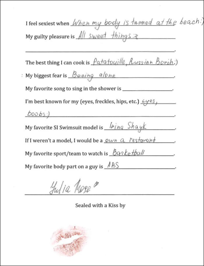 Next up is Yulia Rose, a beautiful Russian who loves to watch basketball and thinks abs are the hottest part on a guy. Did we mention, that like many of our other casting call participants, she's also not afraid of freezing ocean water if it means getting the perfect bikini shot?